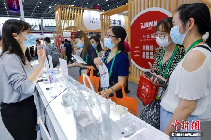 資料圖:5月7日,首屆中國國際消費(fèi)品博覽會(huì)在海南??陂_展。圖為嘉賓在首屆消博會(huì)日本館了解商品。 中新社記者 駱云飛 攝