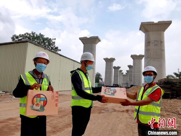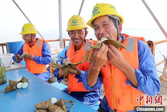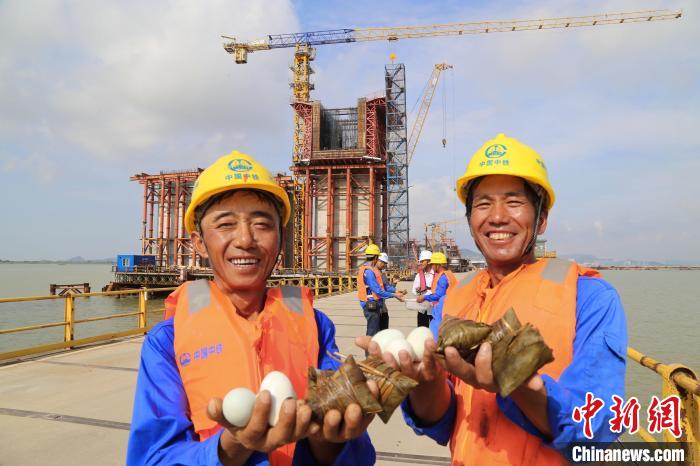 珠機(jī)城際鐵路金海大橋項(xiàng)目是廣東省重點(diǎn)工程,端午節(jié)期間有450余名員工堅(jiān)守工作崗位,其中大多數(shù)員工在珠海已連續(xù)度過了4個(gè)端午節(jié)。近日,金海大橋工地安裝托架班組的農(nóng)民工黃本成、陶禮海等工友開心領(lǐng)到一份中鐵大橋局珠機(jī)城際金海大橋項(xiàng)目部送來的粽子和咸鴨蛋?!拔以谶@個(gè)項(xiàng)目上工作了四年,每次過節(jié)都能收到項(xiàng)目部的禮物,感到非常的高興”!來自湖北恩施的工黃本成說。
