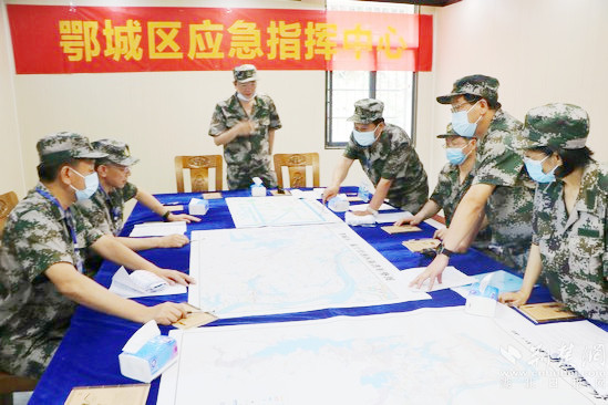 在白雉山水庫應(yīng)急搶險指揮部,接到“白雉山水庫已接近益洪水位,突遇山洪,造成水庫漫壩”的災(zāi)情報告后,現(xiàn)場總指揮董國平迅速組織會商,充分研判災(zāi)情,決定按照《鄂城區(qū)防汛抗旱應(yīng)急預(yù)案》,啟動三級應(yīng)急響應(yīng)。綜合指揮組、人員疏散組、交通管制和治安組、水域救援組、醫(yī)療救助組及疫情防控組、后勤保障組、宣傳報道組等各應(yīng)急聯(lián)動力量,攜帶救援設(shè)備、搶險物資等陸續(xù)到場,依次向指揮部報到并領(lǐng)受任務(wù)。