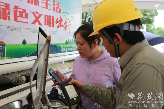 圖為國(guó)網(wǎng)鄂州供電公司員工耐心指導(dǎo)居民如何使用兩輪電動(dòng)車充電樁。(通訊員供圖)
