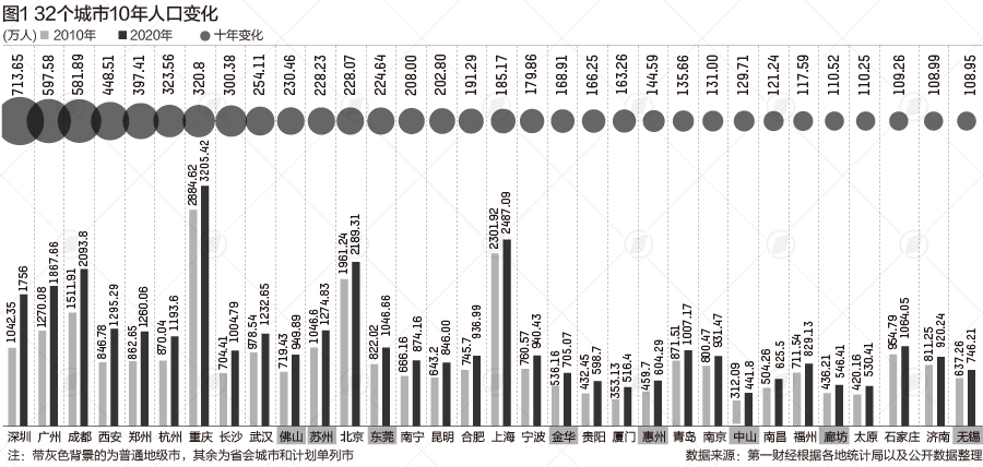 數(shù)據(jù)顯示,十年來,人口增長最多的十大城市分別是深圳、廣州、成都、西安、鄭州、杭州、重慶、長沙、武漢和佛山。