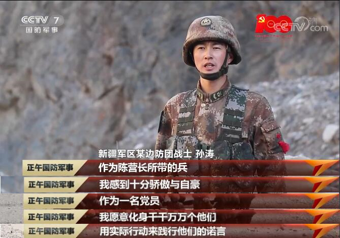 新疆軍區(qū)某邊防團(tuán)戰(zhàn)士 孫濤:作為陳營(yíng)長(zhǎng)所帶的兵,我感到十分驕傲與自豪。作為一名黨員,我愿意化身千千萬萬個(gè)他們,用實(shí)際行動(dòng)來踐行他們的諾言。