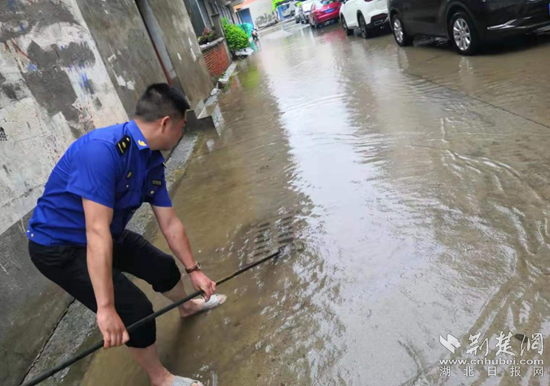 黃梅縣城管執(zhí)法局冒雨進(jìn)行排澇清障工作。通訊員 供圖