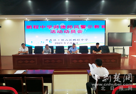 7月9日上午,黃石開(kāi)發(fā)區(qū)·鐵山區(qū)鵬程中學(xué)在報(bào)告廳召開(kāi)了師德師風(fēng)警示教育活動(dòng)動(dòng)員會(huì)。會(huì)上傳達(dá)了上級(jí)部門(mén)有關(guān)文件精神,學(xué)習(xí)了典型案例,全體教師簽訂《鵬程中學(xué)師德師風(fēng)承諾書(shū)》。會(huì)議由黨支部書(shū)記、校長(zhǎng)柏建敏主持,全體教師參加了會(huì)議。