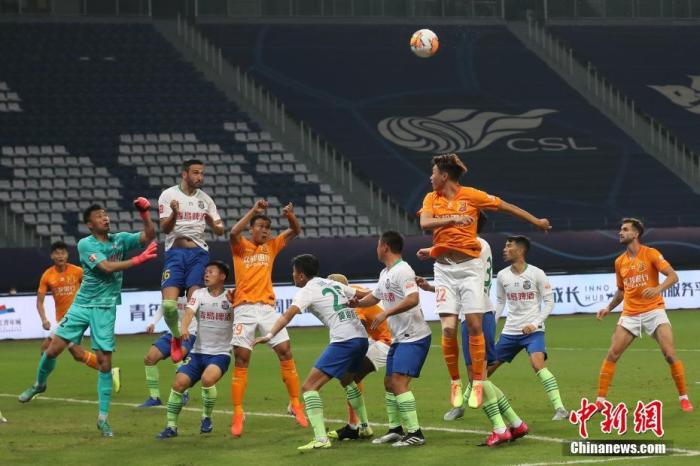 資料圖:2020中國(guó)足球協(xié)會(huì)超級(jí)聯(lián)賽(蘇州賽區(qū))打響揭幕戰(zhàn),最終武漢卓爾隊(duì)(橙色上衣)以2比0戰(zhàn)勝青島黃海青港隊(duì)(白色上衣)。中新社記者 泱波 攝