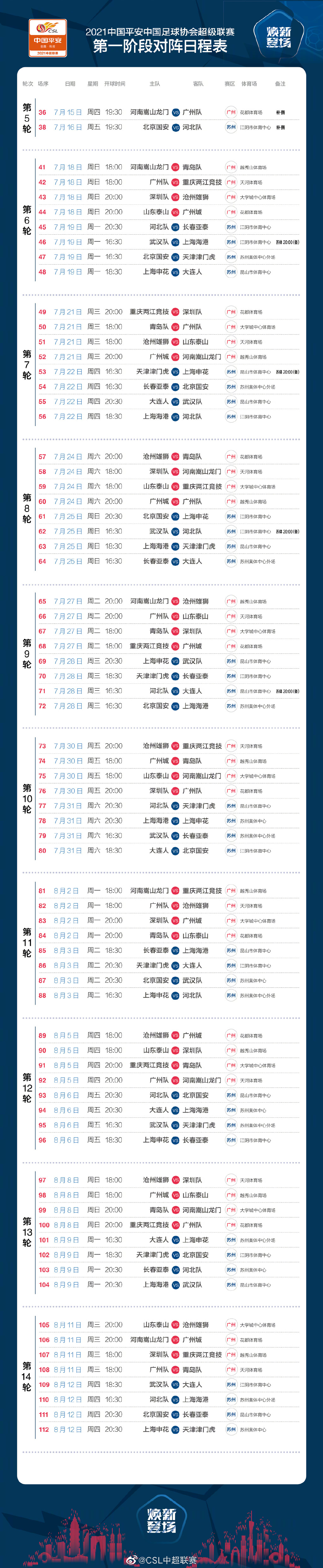 賽程表顯示,第5輪兩場(chǎng)補(bǔ)賽將分別于7月15日和7月16日進(jìn)行,第6-14輪比賽將于7月18日-8月12日進(jìn)行。每支隊(duì)伍比賽頻率為3天1場(chǎng),舉辦地點(diǎn)依然是廣州、蘇州兩地。