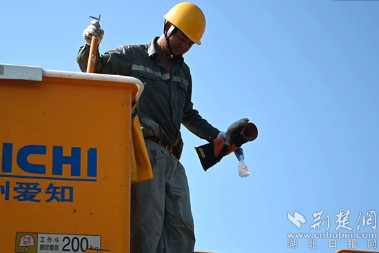半空中,王定操作著車斗在導線間穿梭,在作業(yè)面導線兩端安裝上紅色的絕緣遮蔽罩,用電動扳手擰開螺絲,解開引流線,全然不顧汗水浸濕了工作服。