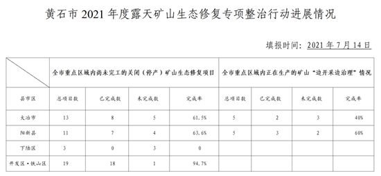 黃石市重點區(qū)域內(nèi)正在生產(chǎn)的礦山“邊開采邊治理”情況,大冶市總項目5個,已完成2個,完成率40%;陽新縣總項目5個,已完成3個,完成率60%。(荊楚網(wǎng)綜合黃石市委宣傳部官方微信號“黃石發(fā)布”)