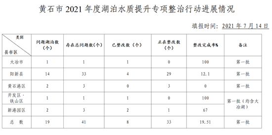黃石市通報(bào)了2021年度湖泊水質(zhì)提升專(zhuān)項(xiàng)整治行動(dòng)進(jìn)展情況,其中大冶市問(wèn)題湖泊1個(gè),存在問(wèn)題1個(gè),已整改1個(gè),整改完成率100%;陽(yáng)新縣問(wèn)題湖泊14個(gè),存在問(wèn)題33個(gè),已整改4個(gè),整改完成率12.1%;黃石港區(qū)問(wèn)題湖泊2個(gè),存在問(wèn)題3個(gè),已整改0個(gè),整改完成率0;開(kāi)發(fā)區(qū).鐵山區(qū)問(wèn)題湖泊1個(gè),存在問(wèn)題1個(gè),已整改1個(gè),整改完成率100%;新港園區(qū)問(wèn)題湖泊1個(gè),存在問(wèn)題3個(gè),已整改1個(gè),整改完成率67%;