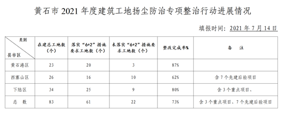 此外,黃石市通報(bào)了2021年度建筑工地?fù)P塵防治專(zhuān)項(xiàng)整治行動(dòng)進(jìn)展情況,黃石港區(qū)在建總工地?cái)?shù)23個(gè),未整改3個(gè),整改完成率87%;西塞山區(qū)在建總工地?cái)?shù)26個(gè),未整改10個(gè),整改完成率62%;下陸區(qū)在建總工地?cái)?shù)34個(gè),未整改9個(gè),整改完成率73%.(荊楚網(wǎng)綜合黃石市委宣傳部官方微信號(hào)“黃石發(fā)布”)