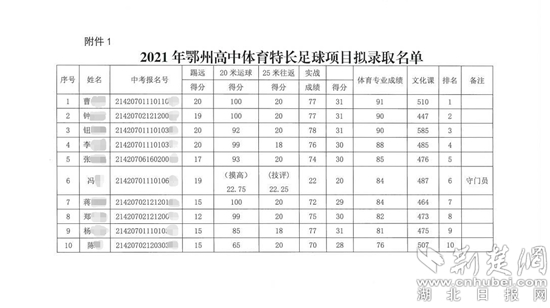 2021年鄂州高中體育特長足球和田徑項目擬錄取名單公示。來源:鄂州市教育局