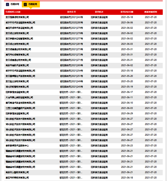 記者梳理發(fā)現(xiàn),上述公開(kāi)的31條處罰信息,主要涉及物流運(yùn)輸領(lǐng)域,處罰事由包括“超限、車(chē)輛擅自改裝、使用未取得《道路運(yùn)輸證》的車(chē)輛從事貨物運(yùn)輸、擅自改裝已取得車(chē)輛營(yíng)運(yùn)證的車(chē)輛”等。罰款金額也從3000元到20000元不等。