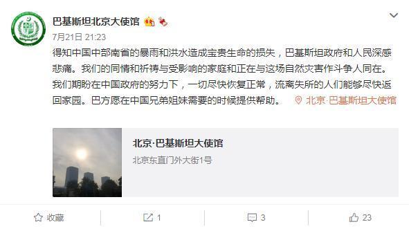 巴基斯坦駐華大使館也表達了對河南災(zāi)情的關(guān)切,在微博上寫道,得知中國河南省的暴雨和洪水造成寶貴生命的損失,巴基斯坦政府和人民深感悲痛?!拔覀兤谂卧谥袊呐ο拢磺斜M快恢復(fù)正常,流離失所的人們能夠盡快返回家園。巴方愿在中國兄弟姐妹需要的時候提供幫助。”