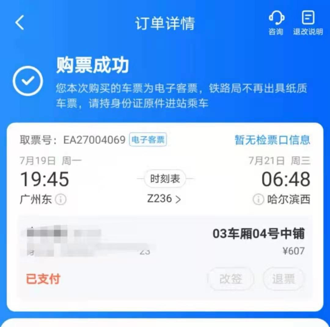 7月22日,該趟列車(chē)的乘客張?jiān)拢ɑ└嬖V澎湃新聞,因母親患白血病情況危急,她購(gòu)買(mǎi)了7月19日從廣州回哈爾濱老家的火車(chē)票,花費(fèi)六百余元,預(yù)計(jì)7月21日到達(dá),但目前已在河南滯留超48小時(shí)。她說(shuō),中途曾有一批乘客自行下車(chē),現(xiàn)在剩下來(lái)的基本都是想回哈爾濱的。