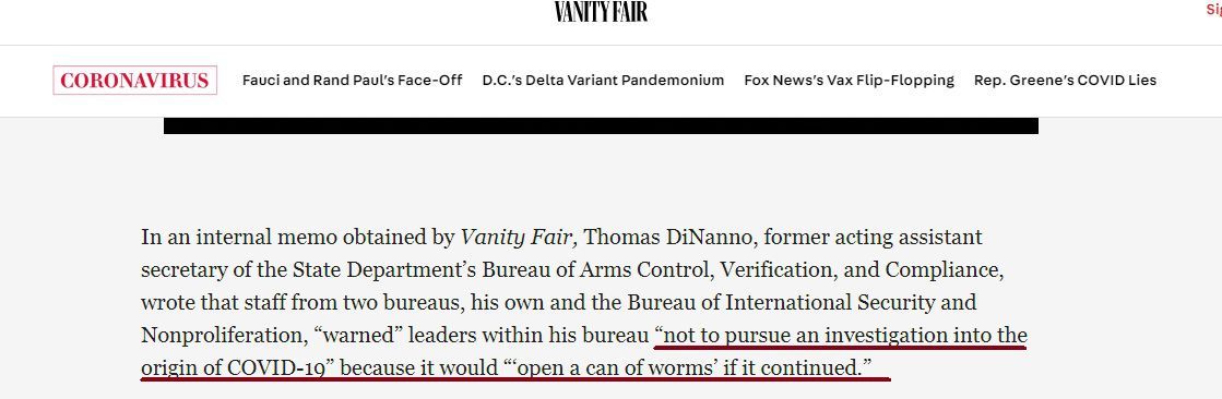 文章說(shuō),美國(guó)前國(guó)務(wù)院官員被同事警告“不要對(duì)新冠病毒的來(lái)源進(jìn)行調(diào)查”,因?yàn)椤叭绻^續(xù)調(diào)查,就會(huì)‘揭開一罐裝滿蠕蟲的罐頭’”。