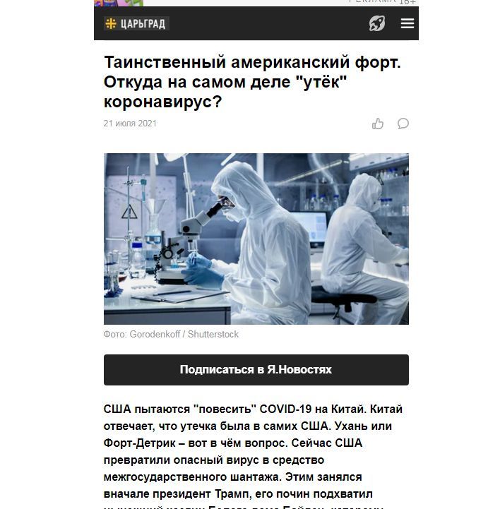 △俄羅斯“Tsargrad”電視臺(tái)網(wǎng)站報(bào)道《隱秘的美國(guó)德特里克堡 新冠病毒到底從何處流出?》截圖