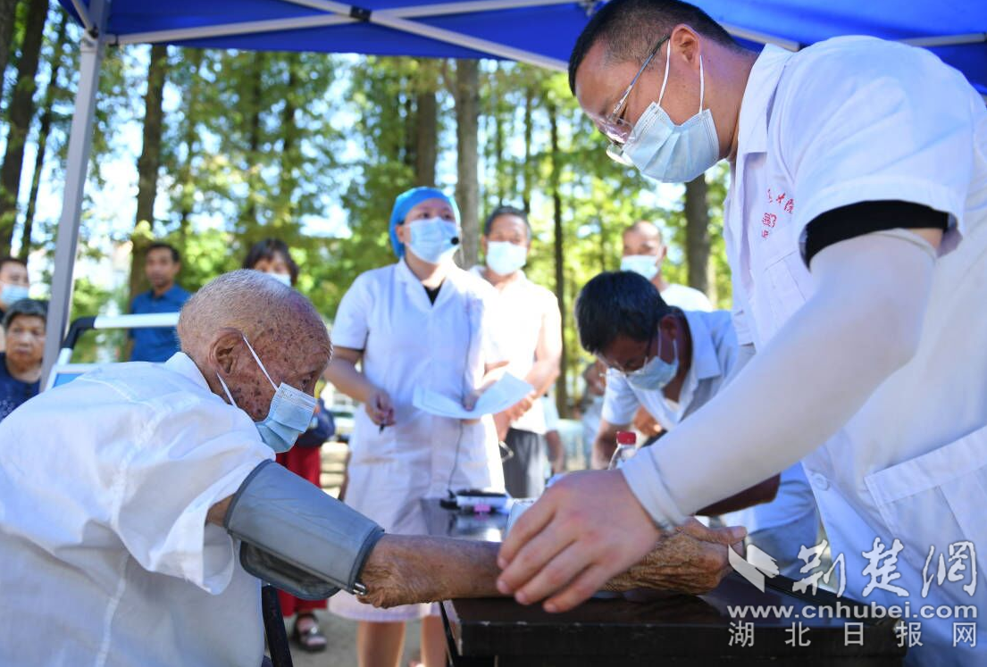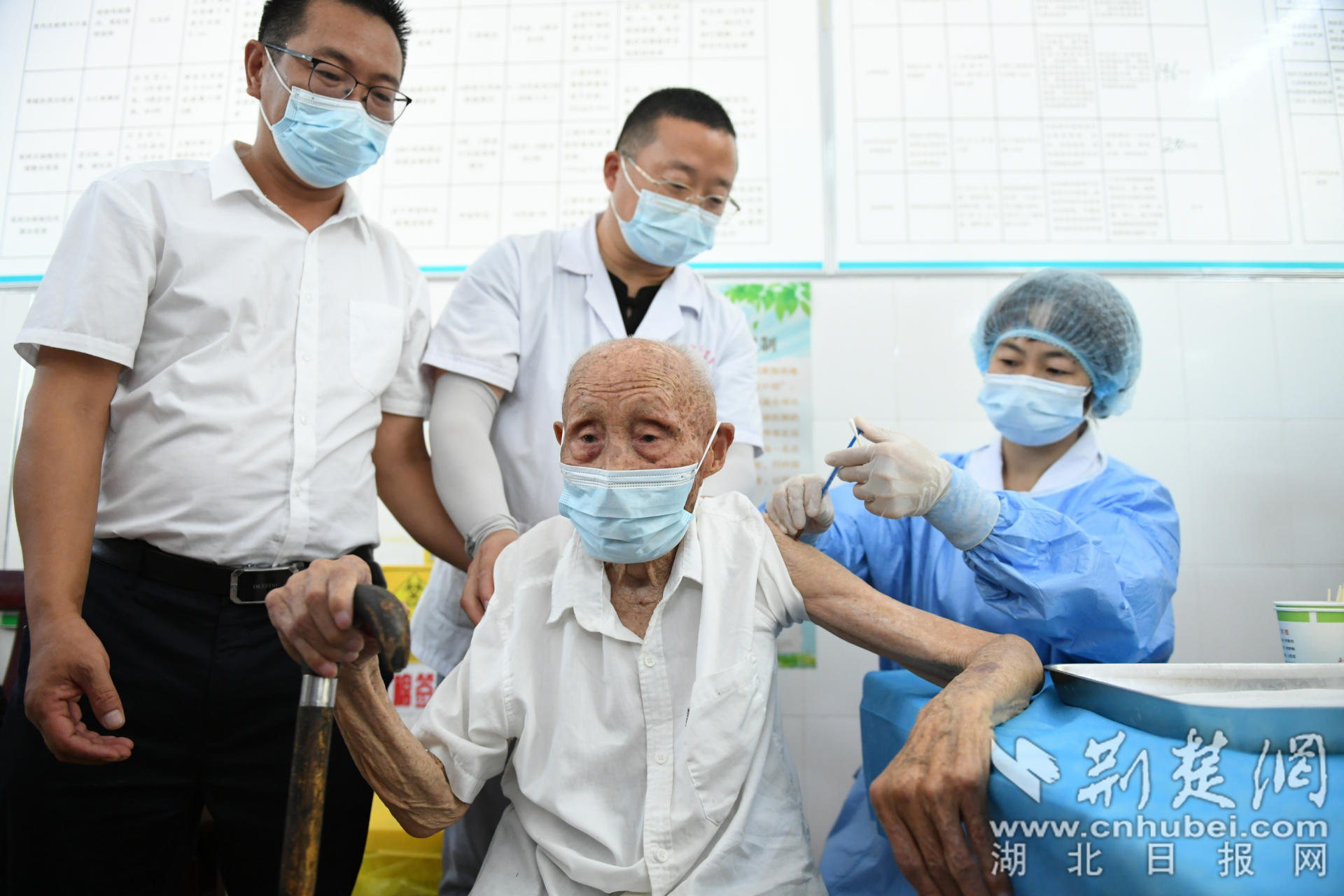 荊楚網(wǎng)(湖北日報(bào)網(wǎng))訊(通訊員吳燕軍)7月25日,潛江市后湖農(nóng)場衛(wèi)生院新冠疫苗接種現(xiàn)場,105歲老人曹華章正在接種新冠疫苗。老人身體健康,行動(dòng)自如,接種前的體檢——血壓高壓119,低壓77,心律73,符合接種條件。