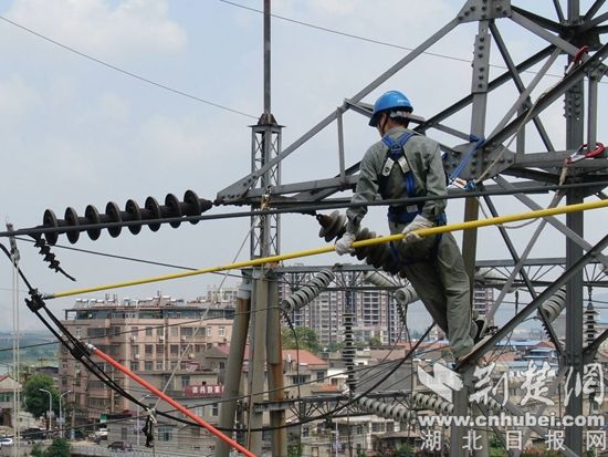 荊楚網(wǎng)(湖北日?qǐng)?bào)網(wǎng))訊(通訊員 曹祥魁 朱培基 成林軒)8月3日,時(shí)值“中伏”,酷暑難耐。在15余米的鐵塔上,帶電工葉俊和陳??嚲o了腰間的安全帶,手持4米長(zhǎng)的絕緣操作桿,盡力往外探著身子,吃力地將帶電線(xiàn)夾固定在導(dǎo)線(xiàn)上,然后通過(guò)旋轉(zhuǎn)操作桿將螺絲擰緊。汗水順著臉頰流淌著,后背也全部濕透。