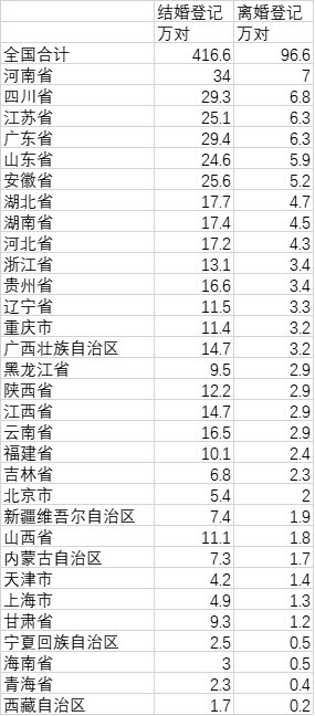 實(shí)際上,河南不止是離婚人數(shù)最多,結(jié)婚人數(shù)也是位居全國(guó)第一。數(shù)據(jù)顯示,上半年河南結(jié)婚登記達(dá)到了34萬(wàn)對(duì),比第二名的廣東高出了4.6萬(wàn)對(duì)。