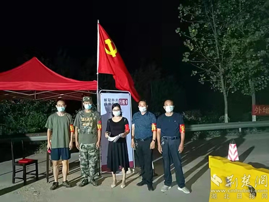 在勝利鎮(zhèn)松子關(guān)省際卡口,由鎮(zhèn)村組成的志愿者隊伍克服酷熱,晝夜嚴(yán)格排查過往司乘車輛,摸排中高風(fēng)險地區(qū)來羅返羅人員,在他們身后,鮮艷的黨旗迎風(fēng)飄揚。