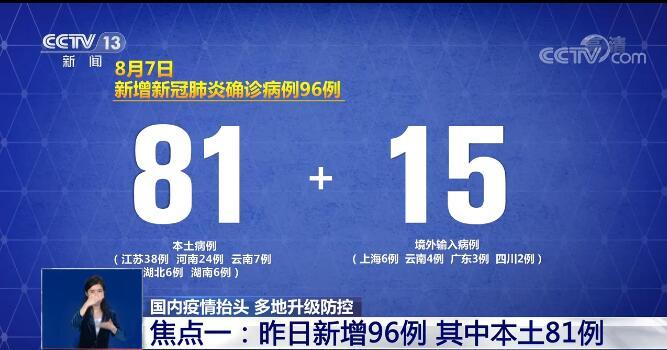 焦點(diǎn)一:先來從數(shù)據(jù)看變化。國家衛(wèi)健委今天(8月8日)發(fā)布,昨天(7日)各地報告新增新冠肺炎確診病例96例,其中,本土病例81例,分別為江蘇38例,河南24例,云南7例,湖北6例,湖南6例。另外15例為境外輸入病例,分別為上海6例,云南4例,廣東3例,四川2例。