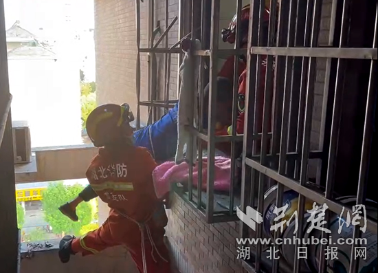 在千鈞一發(fā)之際,指揮員根據(jù)現(xiàn)場情況,指派兩名消防員繞進(jìn)屋內(nèi),隔著防盜窗迅速將老人手臂緊緊抓住,為其佩戴安全綁帶,防止意外事故發(fā)生,期間,老人情緒較為激動(dòng),不停的進(jìn)行劇烈掙扎,一名救援人員手臂險(xiǎn)些被咬;隨即,一名消防員在做好防護(hù)措施后,沿樓外防護(hù)梁飛撲將老人緊緊控制。待確認(rèn)安全后,消防員利用破拆工具小心翼翼將防盜窗破拆,將老人強(qiáng)行拉救出。