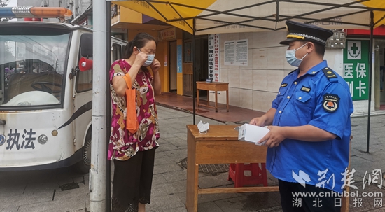 紅安縣城管執(zhí)法隊員向市民發(fā)放口罩。通訊員供圖