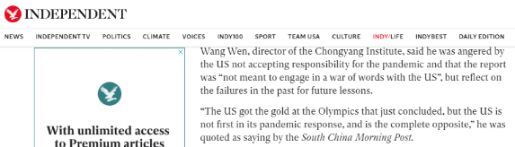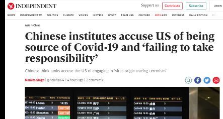 8月10日,英國《獨立報》發(fā)表《中國機構(gòu)指責美國為新冠病毒來源且“逃避責任”》一文。該文如實引用了研究報告中關(guān)于“兩大黨派競爭下的聯(lián)邦體系未能承擔起責任,在不同層面上推諉扯皮。這構(gòu)成了抗擊大流行病的‘不團結(jié)的美國’形象”以及“美國不是在遏制病毒的全球傳播,而是在從事‘病毒來源追蹤恐怖主義’”等原文。