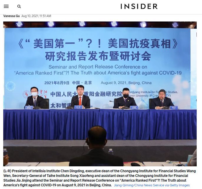 美國知名全球數(shù)字媒體平臺Insider在8月10日發(fā)表《彭博社6月份稱美國抗疫排名世界第一后,3家中國智庫對其進行抨擊》一文,詳細介紹了報告內(nèi)容,并直接關(guān)聯(lián)了人大重陽研究院官網(wǎng)的英文版PDF報告鏈接。Insider指出,該報告在分析美國抗疫措施時主要參考了包括《紐約時報》《華盛頓郵報》和CNN在內(nèi)的美國媒體資訊。報告概述了美國抗疫的失敗,指出了日益擴大的貧富差距、系統(tǒng)性的種族主義和在槍支管制方面的失敗,并直接轉(zhuǎn)引報告原句“美國在病毒溯源問題上搞‘有罪推定’,是企圖操縱‘全球輿論’”。