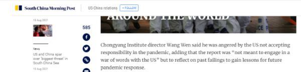 《南華早報》還引用了報告發(fā)布人人大重陽研究院執(zhí)行院長王文的話,他對美國逃避新冠疫情責任而感到憤怒,他表示該報告“不是為了與美國打輿論戰(zhàn),而是對過去的失敗進行反思,避免未來重蹈覆轍”。