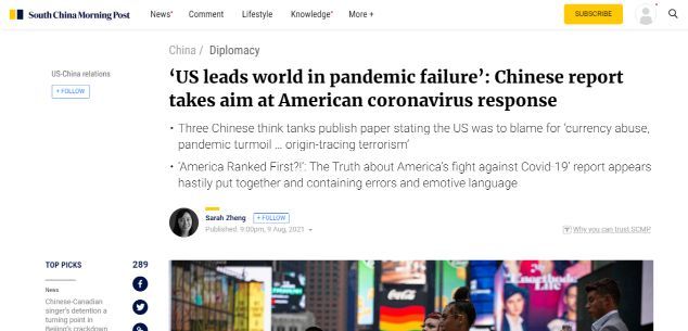 8月9日,《南華早報》發(fā)表文章《“美國抗疫失敗,全球領(lǐng)先”,中國報告瞄準美國抗疫應對》,并重點轉(zhuǎn)引了研究報告內(nèi)容。報道稱,該報告概述了美國媒體報道的美國政府在應對新冠疫情方面的失誤、日益惡化的貧富差距、美國的種族沖突甚至槍支暴力。報道同時引用了報告所得出的美國“八個第一”的結(jié)論:美國是當之無愧的全球第一抗疫失敗國、全球第一政治甩鍋國、全球第一疫情擴散國、全球第一政治撕裂國、全球第一貨幣濫發(fā)國、全球第一疫期動蕩國、全球第一虛假信息國、全球第一溯源恐怖主義國。