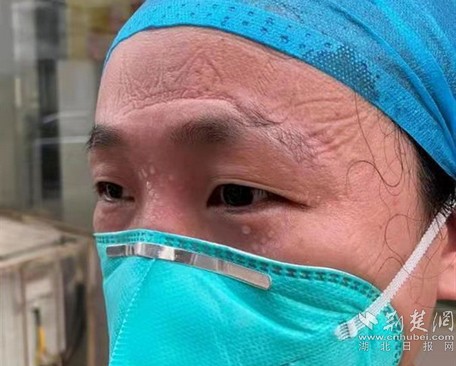 黃梅縣人民醫(yī)院護(hù)士張思冰脫去防護(hù)服滿臉勒痕和汗水。通訊員供圖
