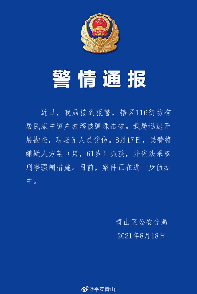 央視網(wǎng)消息:據(jù)18日@平安青山,武漢市青山區(qū)公安分局官方微博通報(bào)居民家中遭鋼珠襲擊案件。