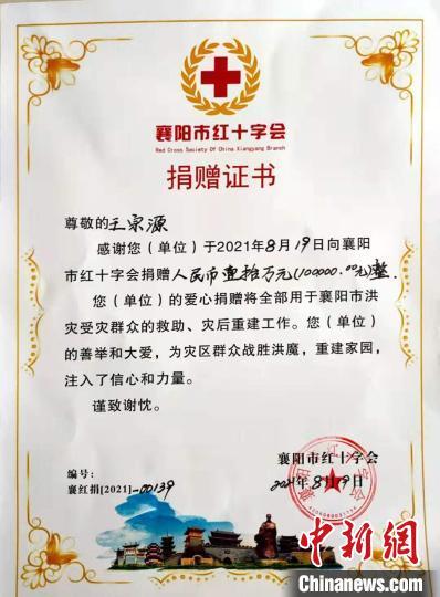 襄陽市紅十字會出具的捐贈證書 受訪單位提供