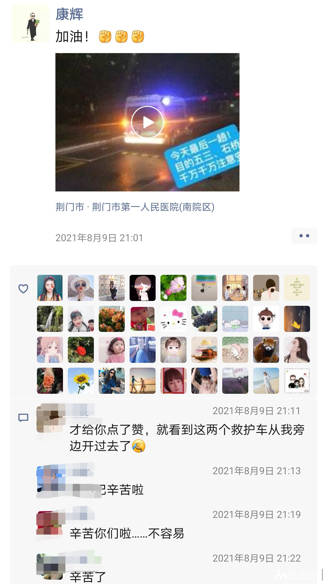 負責車隊指揮調度工作的康輝拍攝小視頻,祝福深夜出發(fā)的同事平安歸來,祝?;颊咴缛湛祻?/p>