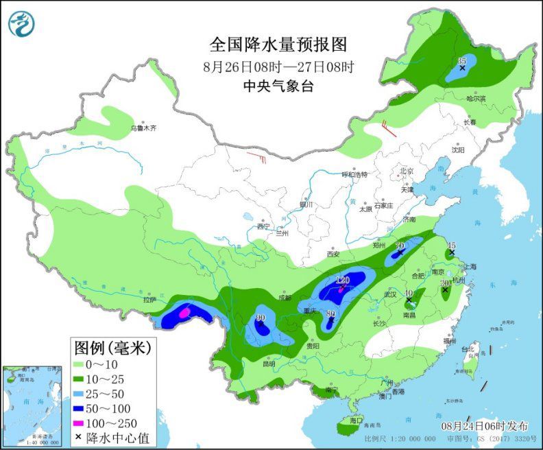 預(yù)計(jì), 8月24日08時(shí)至25日08時(shí),江蘇南部、安徽中南部、湖北東南部、湖南北部、江西西北部、重慶東南部、貴州東部、云南以及內(nèi)蒙古東部、吉林西部和南部、遼寧東部等地部分地區(qū)有大到暴雨,局地有大暴雨(100~150毫米)。上述部分地區(qū)伴有短時(shí)強(qiáng)降水(最大小時(shí)降雨量20~50毫米,局地可超過(guò)70毫米),局地有雷暴大風(fēng)等強(qiáng)對(duì)流天氣(見(jiàn)圖1)。中央氣象臺(tái)8月24日06時(shí)繼續(xù)發(fā)布暴雨藍(lán)色預(yù)警。