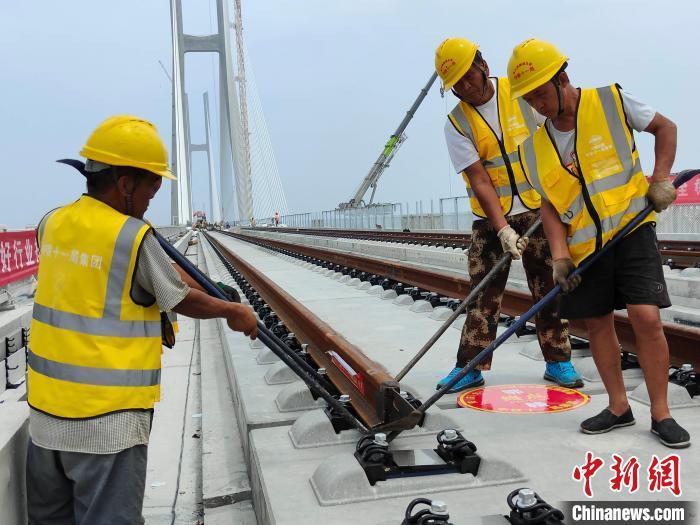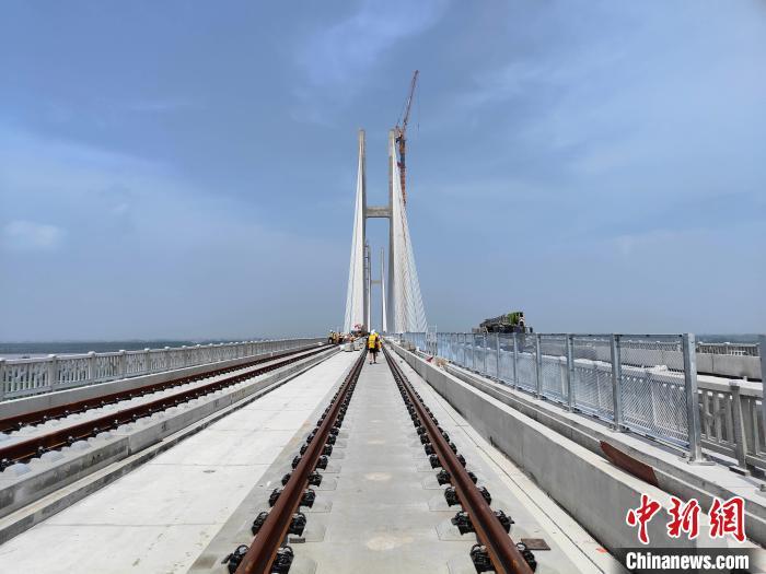 圖為,安九高鐵鳊魚洲長江大橋完成鋪軌 韓新虎 攝