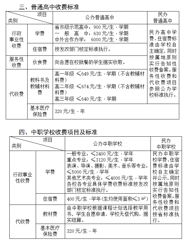 普通高中:一般高中630元/生/學期
