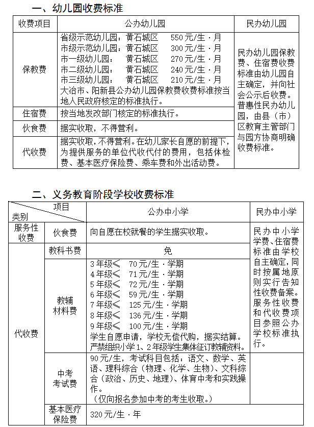 黃石市2021年秋季中小學(幼兒園)收費標準。來源:黃石市教育局官網(wǎng)