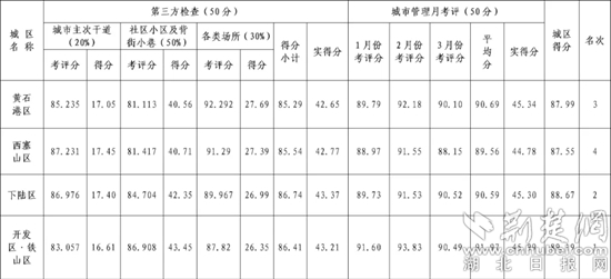 按照第三方季度暗訪成績與城市管理月考評成績各占50%計算,第1季度各城區(qū)綜合考評中,第一名是開發(fā)區(qū)·鐵山區(qū)89.19分,其次分別是下陸區(qū)88.67分、黃石港區(qū)87.99分、西塞山區(qū)87.55分;第2季度各城區(qū)綜合考評中,第一名是西塞山區(qū)88.40分,其次分別是下陸區(qū)88.13分、黃石港區(qū)88.08分、開發(fā)區(qū)·鐵山區(qū)87.91分。西塞山區(qū)實現(xiàn)逆勢奪冠。
