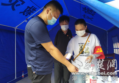 8月17日9時(shí)許,掇刀石街道關(guān)帝社區(qū)景山花園小區(qū)入口處,趙敏動(dòng)作熟練地為居民測(cè)量體溫,丈夫何軍權(quán)在一旁緊盯著溫度計(jì)屏幕,提醒居民先掃碼再進(jìn)出。