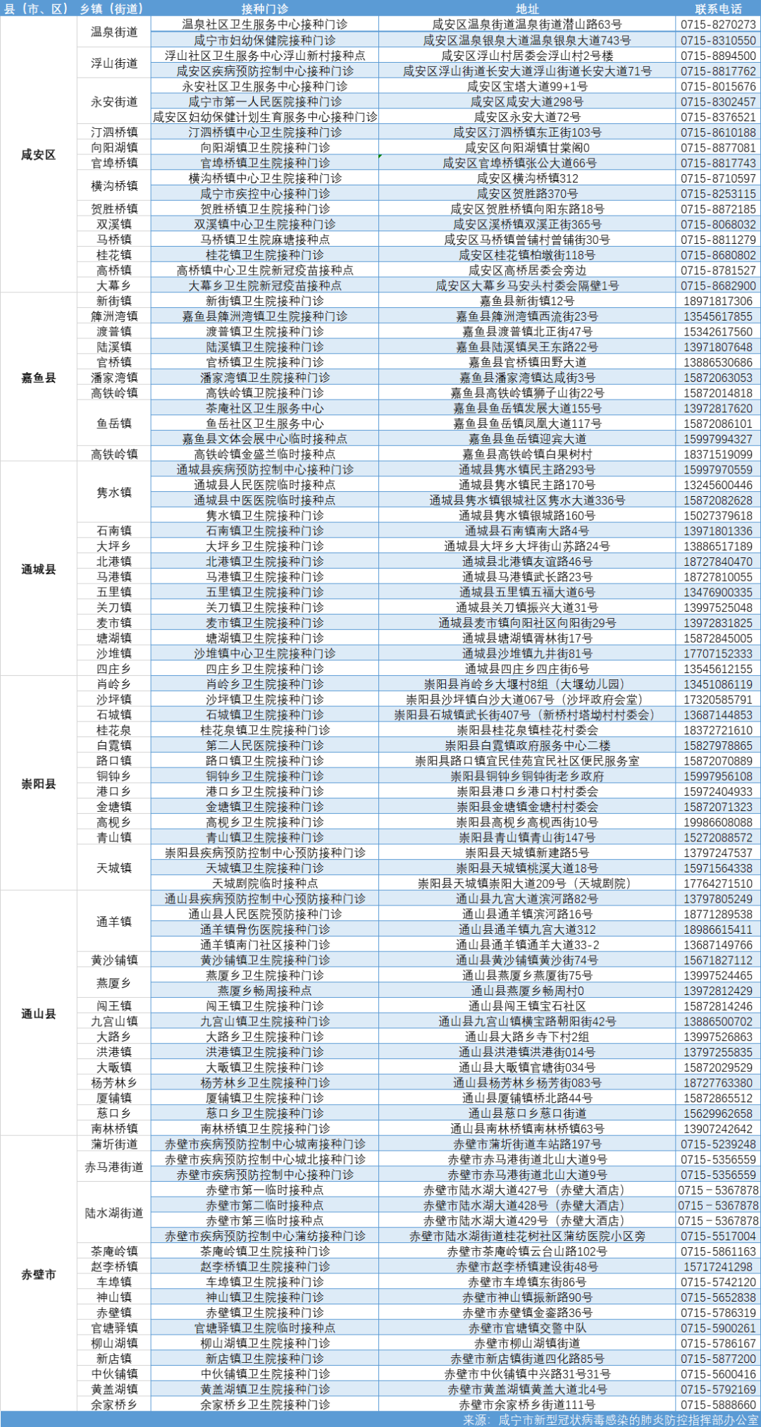 咸寧市新冠疫苗接種門診(點)服務信息: