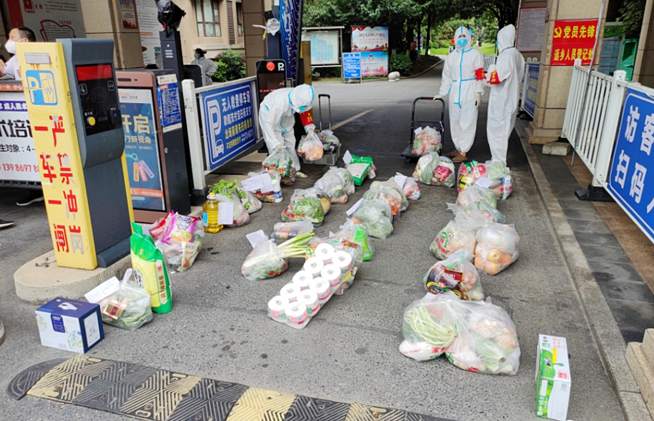 “物資到了學(xué)校南一門,有生鮮,需馬上配送?!?月12日中午12點(diǎn),張友濤在幫蘇奶奶買藥的路上,又接到了任務(wù)。他邊趕路邊通知物資保障組到南一門取物資。