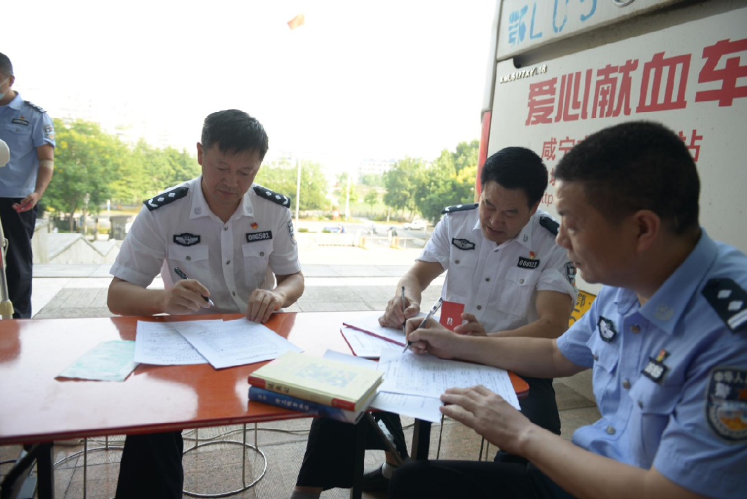 在咸寧公安主樓門廊中,聞訊趕來的民輔警整齊列隊(duì),按照醫(yī)務(wù)人員的指引,依次進(jìn)行信息登記、血液檢查、靜脈采血。有多次參加獻(xiàn)血的“金獎(jiǎng)老將”,也有初次上陣的“警營新兵”,還有尚在見習(xí)期的“學(xué)警新秀”。心照不宣的接力,在新老交織中流淌、賡續(xù)、傳承,匯聚起愛的暖流!