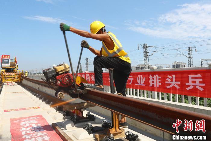 圖為9月10日,安九高鐵鋪軌現(xiàn)場,施工人員對長軌進(jìn)行切割?!⒄祭?攝