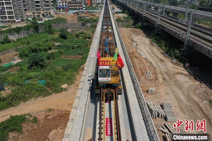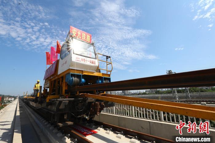 圖為9月10日上午,安九高鐵鋪軌現(xiàn)場,施工人員把長軌鋪設(shè)在無砟道床上?!⒄祭?攝