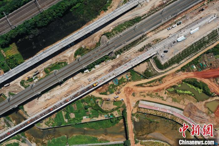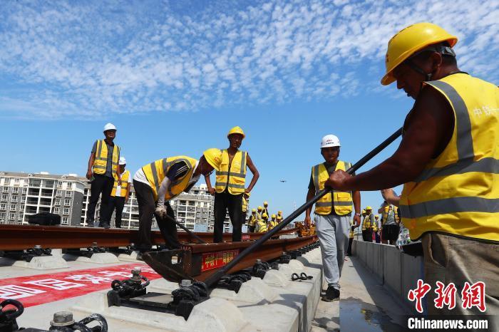 當(dāng)日,中新社記者在安九高鐵鋪軌現(xiàn)場看到,烈日之中,數(shù)十名頭戴安全帽、身穿黃馬甲的工人,在大型鋪軌機(jī)的協(xié)助下,把兩根長長的鋼軌緩緩地鋪在無砟軌道床上。