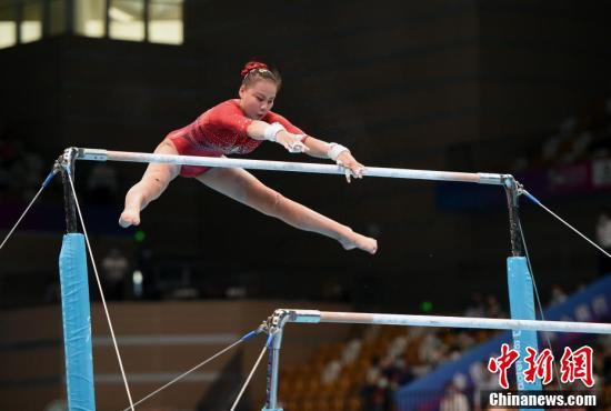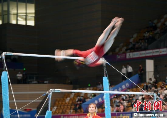 9月20日上午,第十四屆全運(yùn)會(huì)體操女子預(yù)賽在西安舉行。圖為福建選手林子桓在高低杠比賽中。 中新社記者 侯宇 攝