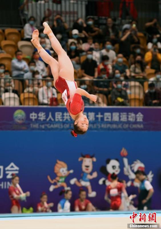 9月20日上午,第十四屆全運(yùn)會(huì)體操女子預(yù)賽在西安舉行。圖為貴州選手黃金勤在自由操比賽中。 中新社記者 侯宇 攝