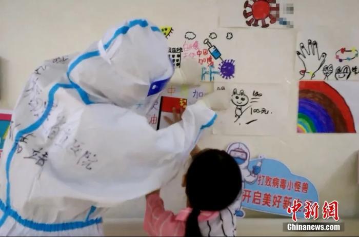 護(hù)士孫嘉靖和五歲的小妹妹一起把畫貼上墻。福建省立醫(yī)院護(hù)理組供圖